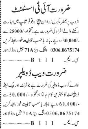 Private Lahore, lahore Punjab Pakistan invites applications from eligible candidates for the post of it assistant and web developer as per advertisement of May 29, 2023 published in daily Jang Newspaper. Candidates with Bachelor and Master etc. educational background will be preferred.