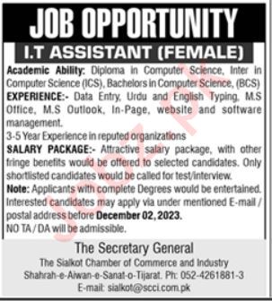 The Sialkot Chamber of Commerce & Industry Sialkot, sialkot Punjab Pakistan invites applications from eligible candidates for the post of it assistant as per advertisement of November 27, 2023 published in daily Jang Newspaper. Educational qualifications required Master and Bachelor etc.