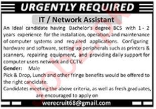 Private Company jobs advertisement dated about 13 July 2025 in daily Jang Newspaper invites application for the vacant post of network assistant and it assistant in Lahore, lahore Punjab Pakistan. Bachelor and Master etc. educational qualification will be preferred.