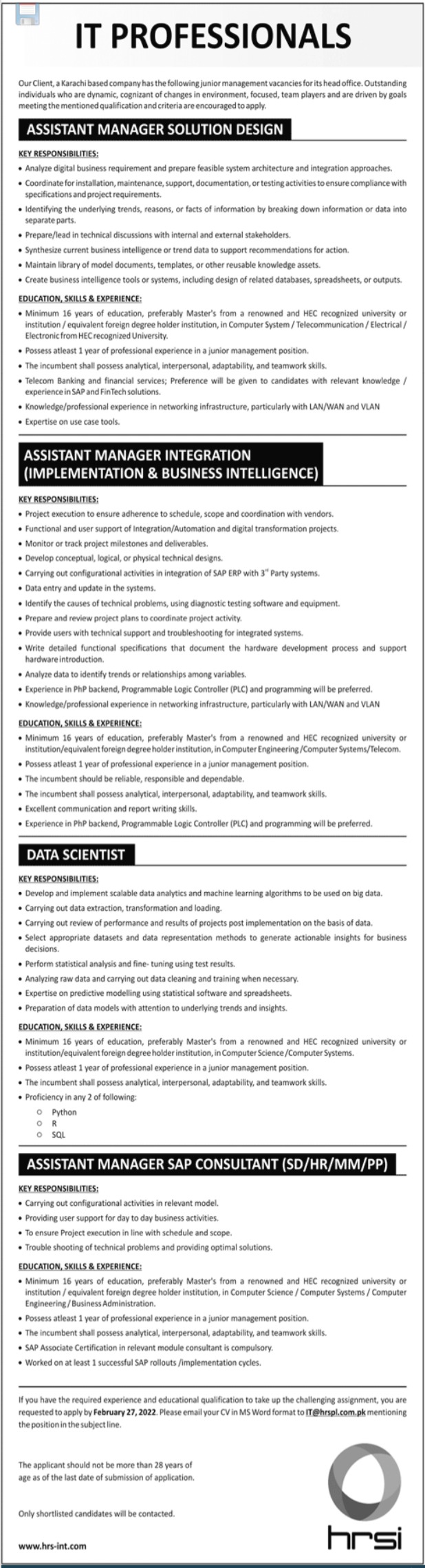 Human Resource Solution International HRSI invites applications for job positions advertised in daily Jang dated 13 February 2022 for following vacancies in Karachi Sindh Pakistan.