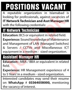 Private Company Rawalpindi, rawalpindi Punjab Pakistan invites applications from eligible candidates for the post of it network technician and assistant manager hr as per advertisement of September 15, 2024 published in daily Jang Newspaper. Candidates with Master and Bachelor etc. educational background will be preferred.