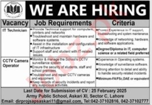 Vacant posts including cctv camera operator and it technician are announced in Army Public School Askari 11 Lahore, lahore Punjab Pakistan as per 16 February 2025 advertisement in daily Jang Newspaper. Persons with Intermediate, Others and DAE etc. education can apply.
