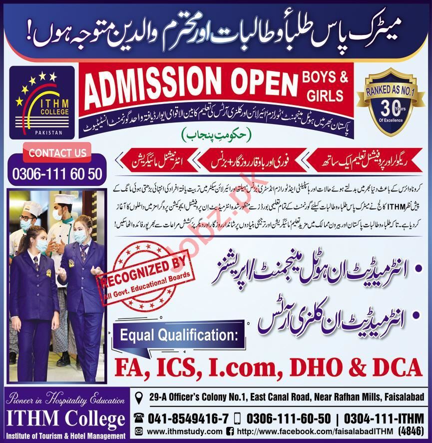 Institute of Tourism & Hotel Management ITHM Faisalabad, Pakistan is starting admissions fall 2020 for the classes of FA, ICS, I Com, DHO Hospitality, IDCA Culinary. Read newspaper ad for exact details.