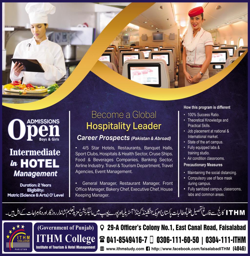 Institute of Tourism & Hotel Management ITHM Government of The Punjab has announced admissions for 2 Years Intermediate in Hotel Management in Faisalabad Punjab 2020. Read newspaper ad for exact details.