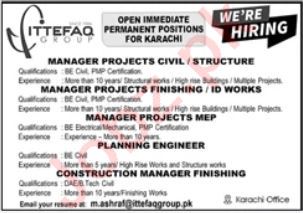 Ittefaq Group jobs advertisement dated about 22 December 2024 in daily Jang Newspaper invites application for the vacant post of manager projects finishing, manager project civil, manager projects mep, planning engineer, manager id works and manager project structure in Karachi, karachi Sindh Pakistan. Persons with DAE, Bachelor, Intermediate and Master etc. education can apply.