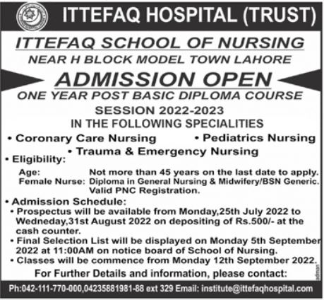 Ittefaq Hospital, Ittefaq College of Nursing Diploma Courses of Coronary Care Nursing, Pediatric Nursing, Trauma & Emergency Nursing admissions 2022 has been started. Eligible students can apply for academic admissions 2022 in Ittefaq College of Nursing Lahore Punjab Pakistan for Medical Medical College. Eligible students for fulfilling criteria for admissions in Diploma and Course can enroll as per Private admission policy 2022 till closing date 31 August 2022. Read newspaper ad for exact details.