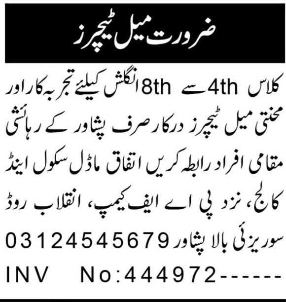Ittefaq Model School & College Peshawar, peshawar Khyber Pakhtunkhwa KPK Pakistan invites applications from eligible candidates for the post of english teacher and teacher as per advertisement of September 11, 2025 published in daily Aaj Newspaper. Bachelor and Master etc. educational qualification will be preferred.