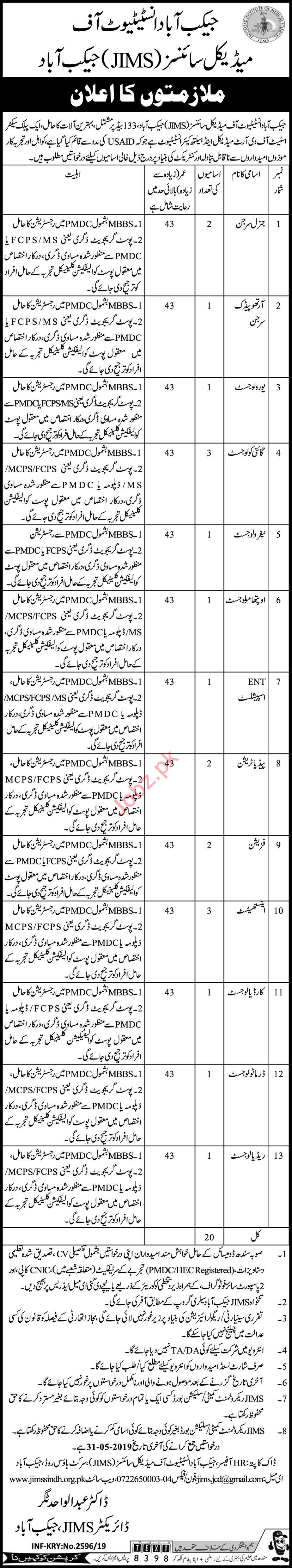 Vacancies in Jacobabad institute of Medical Sciences Advertisement May 2019