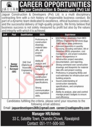 Jaguar Construction & Developer Pvt Ltd jobs advertisement dated about 16 March 2025 in daily Jang Newspaper invites application for the vacant post of quantity surveyor in Chandni Chowk Rawalpindi, rawalpindi Punjab Pakistan. Bachelor etc. educational qualification will be preferred.