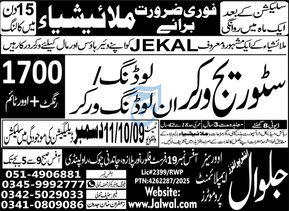 Jalwal Enterprises Kuala Lumpur, malaysia Malaysia invites applications from eligible candidates for the post of loading worker and storage worker as per advertisement of December 8, 2025 published in daily Aaj Newspaper. Educational qualifications required Middle and Primary etc.