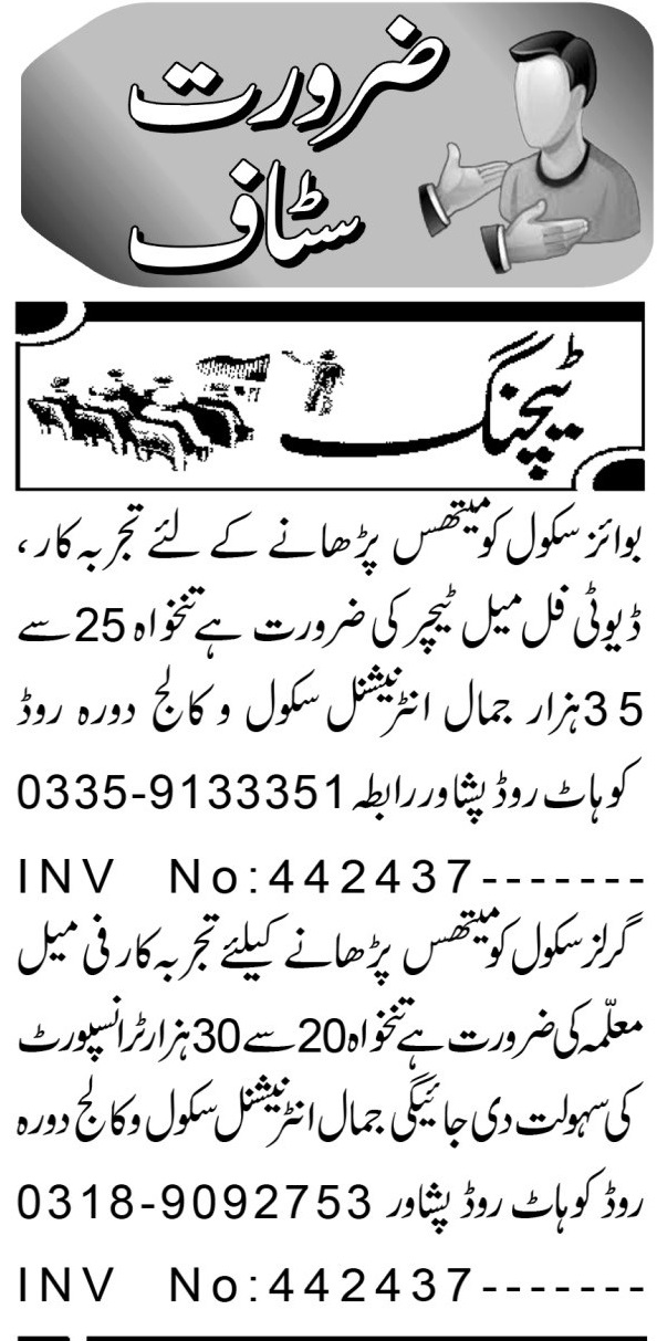 Jamal International College & School System Kohat Road Peshawar, peshawar Khyber Pakhtunkhwa KPK Pakistan invites applications from eligible candidates for the post of female teacher, mathematics teacher and teacher as per advertisement of June 14, 2025 published in daily Aaj Newspaper. Preferred Education is Master, Bachelor and M.sc etc.