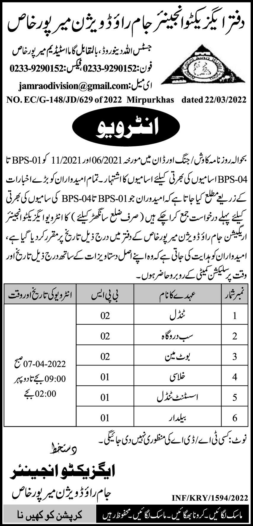 Jamroa Division jobs advertisement dated about 27 March 2022 in daily Express Newspaper invites application for the vacant post of tyndel, khalasi, sub darogha, assistant tyndel, boatman and beldar in Mirpur Khas, mirpur khas Sindh Pakistan. Preferred Education is Primary and Middle etc.