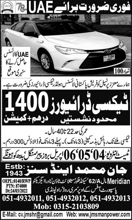 JAN MOHAMMAD AND SONS UAE, uae UAE invites applications from eligible candidates for the post of driver and taxi driver as per advertisement of April 3, 2022 published in daily Express Newspaper. Preferred Education is Matric and Intermediate etc.