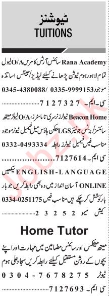 Jang Sunday Classified Ads 1 Jan 2023 For Home Tutor