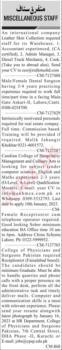 Private Company jobs advertisement dated about 2 January 2023 in daily Jang Newspaper invites application for the vacant post of maths teacher, computer science teacher, dental surgeon, diesel truck mechanic, female receptionist, teacher, english teacher, accountant, real estate marketing staff, telephone operator, admin manager, front desk officer, receptionist and cook in Lahore, lahore Punjab Pakistan. Candidates with Middle, Intermediate, Bachelor and Matric etc. educational background will be preferred.