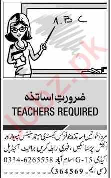 Private School jobs advertisement dated about 2 January 2023 in daily Jang Newspaper invites application for the vacant post of physics teacher, statistics teacher, female teacher, teacher, computer teacher, english teacher, chemistry teacher and mathematics teacher in Islamabad, islamabad Islamabad Pakistan. Preferred Education is Master, Bachelor and Intermediate etc.
