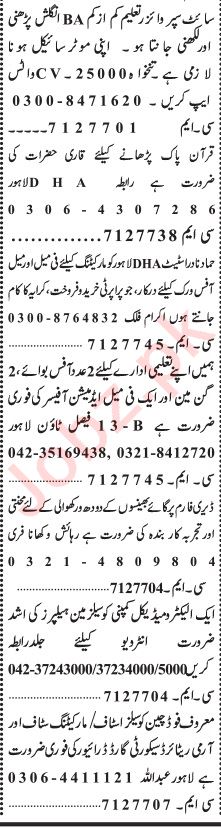 Vacant posts including farm worker, site supervisor, office boy, gunman, marketing staff, helper, sales staff, admission officer, salesman, real estate marketing staff, quran teacher and qari are announced in Private Company Lahore, lahore Punjab Pakistan as per 2 January 2023 advertisement in daily Jang Newspaper. Intermediate, Middle, Matric and Bachelor etc. educational qualification will be preferred.