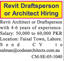 Code Architects jobs advertisement dated about 2 June 2025 in daily Jang Newspaper invites application for the vacant post of draftsman and revit architect in Faisal Town Lahore, lahore Punjab Pakistan. Educational qualifications required DAE, Bachelor and Intermediate etc.