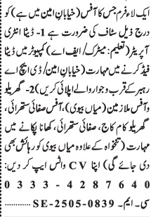 Law Firm Khayaban-e-Amin Lahore, lahore Punjab Pakistan invites applications from eligible candidates for the post of husband wife, cleaner, data entry operator, house worker and office staff as per advertisement of June 2, 2025 published in daily Jang Newspaper. Persons with Matric, Middle and Intermediate etc. education can apply.