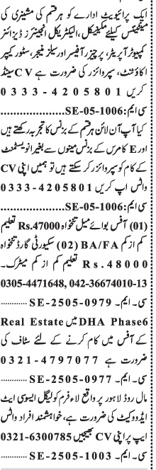 Vacant posts including real estate agent, computer operator, graphic designer, mechanical engineer, ecommerce supervisor, accountant, office boy, engineer, store keeper, sales manager, designer, purchaser, supervisor, electrical engineer, advocate and security guard are announced in Private Company Mall Road Lahore, lahore Punjab Pakistan as per 2 June 2025 advertisement in daily Jang Newspaper. DAE, B.com, Others, Intermediate, Matric, Middle and BA etc. educational qualification will be preferred.