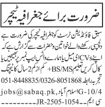 Sabaq Foundation G-10/4 Islamabad, islamabad Islamabad Pakistan invites applications from eligible candidates for the post of teacher and geography teacher as per advertisement of June 2, 2025 published in daily Jang Newspaper. Preferred Education is MS etc.