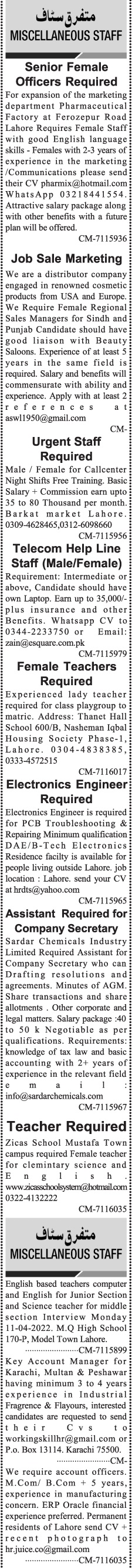 Private Company Lahore, lahore Punjab Pakistan invites applications from eligible candidates for the post of female marketing officer, computer teacher, company secretary, marketing officer, playgroup teacher, regional sales manager, assistant, telecom helpline staff, electronics engineer, sales staff, accountant, female teacher, engineer, call center agent, english teacher, marketing staff, teacher, lady teacher, accounts manager, key account manager, science teacher, accounts officer and female office staff as per advertisement of April 11, 2022 published in daily Jang Newspaper. Educational qualifications required Matric, Intermediate, Middle and Bachelor etc.