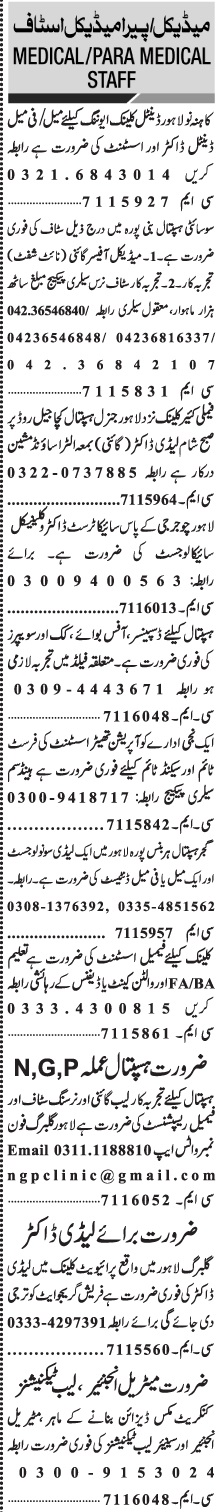 Hospital Clinic jobs advertisement dated about 11 April 2022 in daily Jang Newspaper invites application for the vacant post of psychiatrist, sweeper, sonologist, lab technician, dentist, female assistant, dispenser, medical officer, gynecologist, nursing staff, lady sonologist, lady doctor, dental assistant, nurse, doctor, material engineer, cook, ot assistant, operation theater assistant, receptionist, staff nurse, assistant, office boy, female receptionist and dental doctor in Lahore, lahore Punjab Pakistan. Candidates with MBBS, Matric, Middle, Others, DAE, Intermediate and Bachelor etc. educational background will be preferred.
