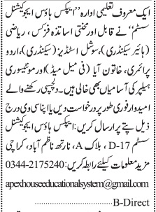 Apex House Educational System jobs advertisement dated about 11 August 2025 in daily Jang Newspaper invites application for the vacant post of montessori helper, aya, lady teacher, physics teacher, maid, mathematics teacher, teacher, primary teacher, urdu teacher and social studies teacher in North Nazimabad Karachi, karachi Sindh Pakistan. Educational qualifications required Master, Matric, MA, Bachelor, Middle and M.sc etc.