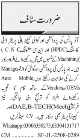 Jang Sunday Classified Ads 10 Aug 2025 For Manufacturing