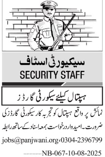 Hospital Clinic jobs advertisement dated about 11 August 2025 in daily Jang Newspaper invites application for the vacant post of security guard and security staff in Karachi, karachi Sindh Pakistan. Candidates with Middle and Matric etc. educational background will be preferred.