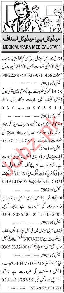 Medical Officer, Radiologist, Nurse, LHV, Doctor, Lady Doctor, Pharmacist, Midwife, Gynecologist, Receptionist, Dispenser, Resident Medical Officer, Pathologist, ICU Technician, CT Scan Technician, X Ray Technician, House Officer, Nursing Instructor, CCTV Assistant, Lab Technician seeks in well reputed hospitals.