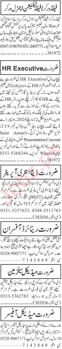 Private Company is looking for candidates for following posts as per job advertisement published in daily Jang Newspaper of March 10, 2024 for location Islamabad, rawalpindi Islamabad Pakistan: