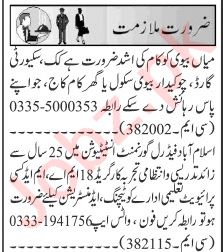 Private Company jobs advertisement dated about 10 March 2024 in daily Jang Newspaper invites application for the vacant post of husband wife, chowkidar, administrator, security guard, cook and teacher in Islamabad, islamabad Islamabad Pakistan. Educational qualifications required Middle, Matric, Master and Bachelor etc.
