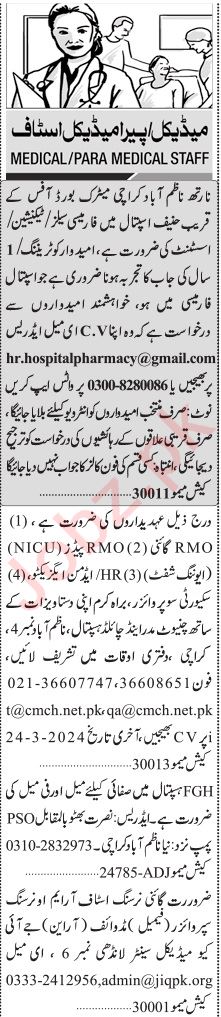 Hospital Clinic invites applications for job positions advertised in daily Jang dated 10 March 2024 for following vacancies in Karachi, karachi Sindh Pakistan.