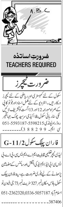 Private School invites applications for job positions advertised in daily Jang dated 11 August 2024 for following vacancies in Islamabad, rawalpindi Islamabad Pakistan.