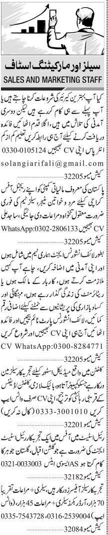 Marketing Company Karachi, karachi Sindh Pakistan invites applications from eligible candidates for the post of sales officer, real estate agent, marketing staff, sales staff, salesman, sales team, manager and insurance agent as per advertisement of August 11, 2024 published in daily Jang Newspaper. Educational qualifications required Bachelor, BA, Intermediate and Matric etc.