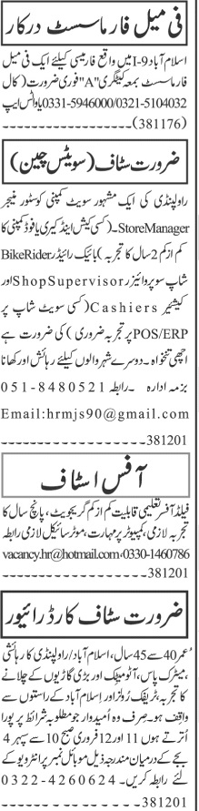 Private Company Islamabad, rawalpindi Islamabad Pakistan invites applications from eligible candidates for the post of pharmacist, driver, bike rider, cashier, store manager, staff car driver, field officer, office staff and shop supervisor as per advertisement of February 11, 2024 published in daily Jang Newspaper. Persons with Intermediate, Middle, I.com, Matric, Bachelor, B Pharmacy, BA and B.com etc. education can apply.