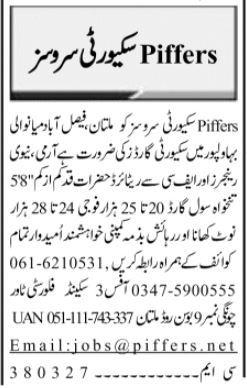 Piffers Security Services Pvt Ltd Multan, mianwali, multan, faisalabad and bahawalpur Punjab Pakistan invites applications from eligible candidates for the post of security guard, fauji guard, security staff and civil guard as per advertisement of February 11, 2024 published in daily Jang Newspaper. Educational qualifications required Intermediate, Middle and Matric etc.