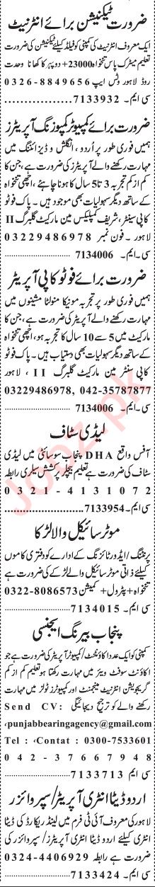 Private Company Lahore, lahore Punjab Pakistan invites applications from eligible candidates for the post of computer composing operator, internet technician, photocopy operator, computer operator, lady office staff, field technician, data entry supervisor, helper, accountant, data entry operator and technician as per advertisement of June 12, 2023 published in daily Jang Newspaper. DAE, Intermediate, B.com, BA, Middle, Matric, BBA and Bachelor etc. educational qualification will be preferred.