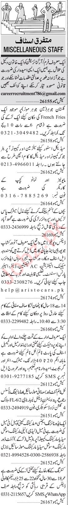 Private Company jobs advertisement dated about 12 June 2023 in daily Jang Newspaper invites application for the vacant post of helper, worker, driver, service advisor, office staff, telemarketing officer, electrician, workshop manager, marketing officer, mechanic, spare parts assistant, salesman, supervisor, ac technician, computer operator, advocate, lawyer, social media manager, factory worker and denter in Karachi, karachi Sindh Pakistan. Candidates with Intermediate, Matric, B.com, DAE, Middle, Bachelor and BA etc. educational background will be preferred.