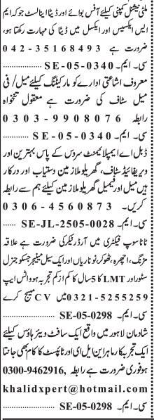 Private Company Shadman Lahore, lahore Punjab Pakistan invites applications from eligible candidates for the post of data analyst, office boy, maid, marketing officer, sales manager, marketing staff, excel expert, house worker, house maid and typist as per advertisement of May 12, 2025 published in daily Jang Newspaper. Intermediate, Middle, BA, DAE, B.com, Bachelor and Matric etc. educational qualification will be preferred.