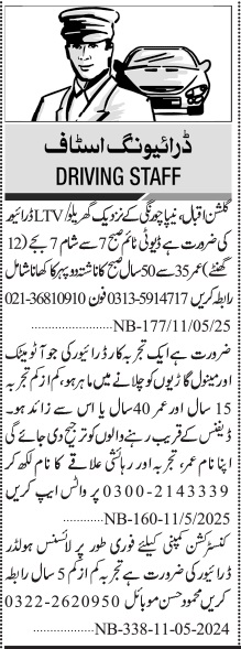 Jang Sunday Classified Ads 11 May 2025 for Driving Staff