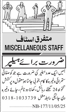 Vacant posts including helper and cleaner are announced in Private Company Karachi, karachi Sindh Pakistan as per 12 May 2025 advertisement in daily Jang Newspaper. Primary and Middle etc. educational qualification will be preferred.