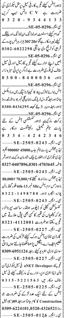 Private Company Ichhra Lahore, lahore Punjab Pakistan invites applications from eligible candidates for the post of personal secretary, office staff, labor, office boy, assistant, female receptionist, computer typist, female office staff, lady secretary, site supervisor and receptionist as per advertisement of May 12, 2025 published in daily Jang Newspaper. Preferred Education is Intermediate, DAE, Bachelor, BA, Matric and Middle etc.
