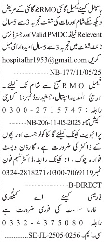 Hospital Clinic Jamshed Road Karachi, karachi Sindh Pakistan invites applications from eligible candidates for the post of nurse, pharmacist, gynecologist, resident medical officer, child specialist, rmo and doctor as per advertisement of May 12, 2025 published in daily Jang Newspaper. Bachelor, DAE, MBBS, Intermediate and Others etc. educational qualification will be preferred.