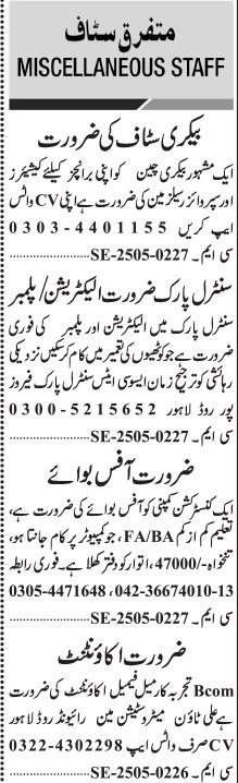 Vacant posts including accountant, cashier, office boy, bakery staff, electrician, supervisor, salesman and plumber are announced in Private Company Ali Town Lahore, lahore Punjab Pakistan as per 12 May 2025 advertisement in daily Jang Newspaper. Bachelor, Intermediate, Matric, DAE, B.com, BA and Middle etc. educational qualification will be preferred.