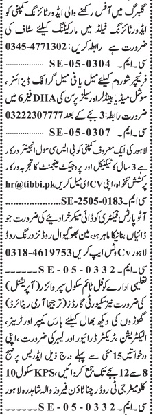 Private Company jobs advertisement dated about 12 May 2025 in daily Jang Newspaper invites application for the vacant post of tractor driver, lathe machine operator, trainer, graphic designer, electrician, horse keeper, civil engineer, labor, school supervisor, technical staff, security guard, engineer, marketing staff, field staff, social media handler, sales person and die maker in DHA Phase 6 Lahore, lahore Punjab Pakistan. Preferred Education is Bachelor, BA, DAE, Middle, Matric and Intermediate etc.