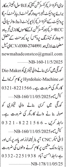 Manufacturing Company jobs advertisement dated about 12 May 2025 in daily Jang Newspaper invites application for the vacant post of civil engineer, lathe turner, cnc operator, factory worker, die maker, hydraulic machine mechanic, project manager and power press operator in Korangi Karachi, karachi Sindh Pakistan. Preferred Education is DAE, Matric, Intermediate, B.E and Bachelor etc.