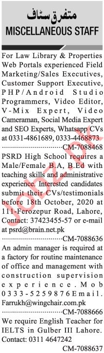 Jang Sunday Classified Ads 11 Oct 2020 For Management Staff