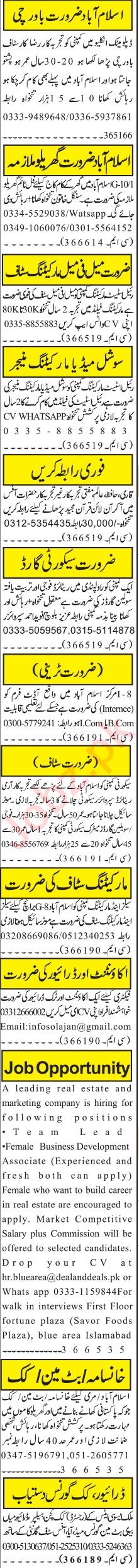 Vacant posts including security supervisor, truck driver, marketing officer, business development associate, maid, house worker, sales staff, husband wife, marketing staff, kitchen helper, office staff, batman, security guard, qari, social media marketing manager, cook, governess, accounts trainee, driver, supervisor, aya, civilian guard, ltv driver, trainee, htv driver, qaria, audit trainee, khansama, accountant and team leader are announced in Private Company Islamabad, rawalpindi Islamabad Pakistan as per 13 February 2023 advertisement in daily Jang Newspaper. Intermediate, Middle, Bachelor and Matric etc. educational qualification will be preferred.